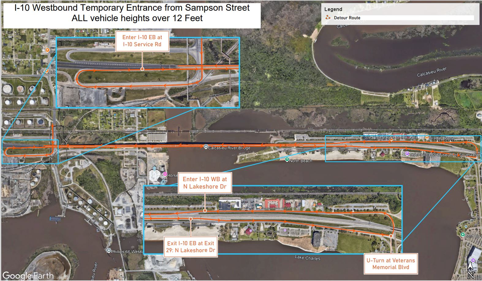 - Trucks over 12 feet must follow a special detour to rejoin I-10 West at N. Lakeshore Drive.